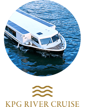 KPG RIVER CRUISEは、美しい緑と高層ビル群が一体となった、四季折々の景観を楽しめる大川をゆったりと1周する2時間のクルージングサービスです。日々の喧騒を忘れて、陽の光できらめく川面、夜を彩る夜景、刻一刻と表情を変える水の上でしか見ることができない大阪の魅力をお愉しみください。